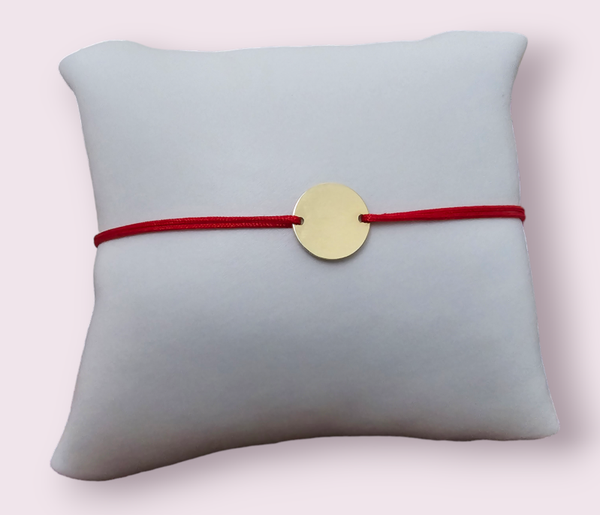 Brățară realizată manual din șnur reglabil , cu un pandantiv rotund tip bănuț (13mm) gold filled 14k și, opțional, biluțe gold filled de 14K (2.5mm) pentru un accent elegant.