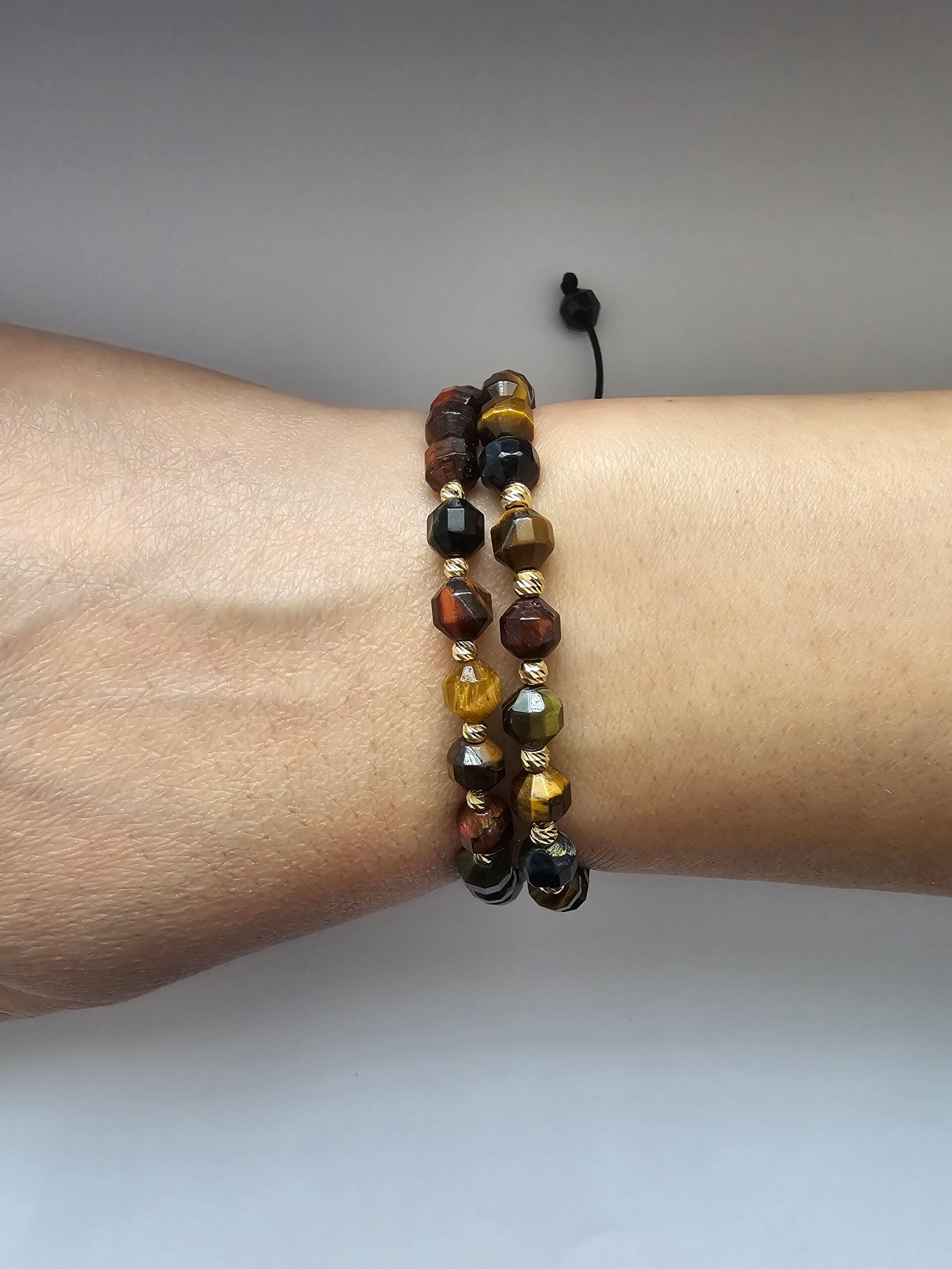 Brățară cu pietre naturale Ochi de tigru curcubeu, realizată manual pe șnur negru reglabil, cu biluțe din aur de 14K (disponibile în mărimi de 2.5 mm sau 3 mm- 6 bilute ) si pietre naturale Ochi de tigru curcubeu (disponibile în mărime de 6 mm).