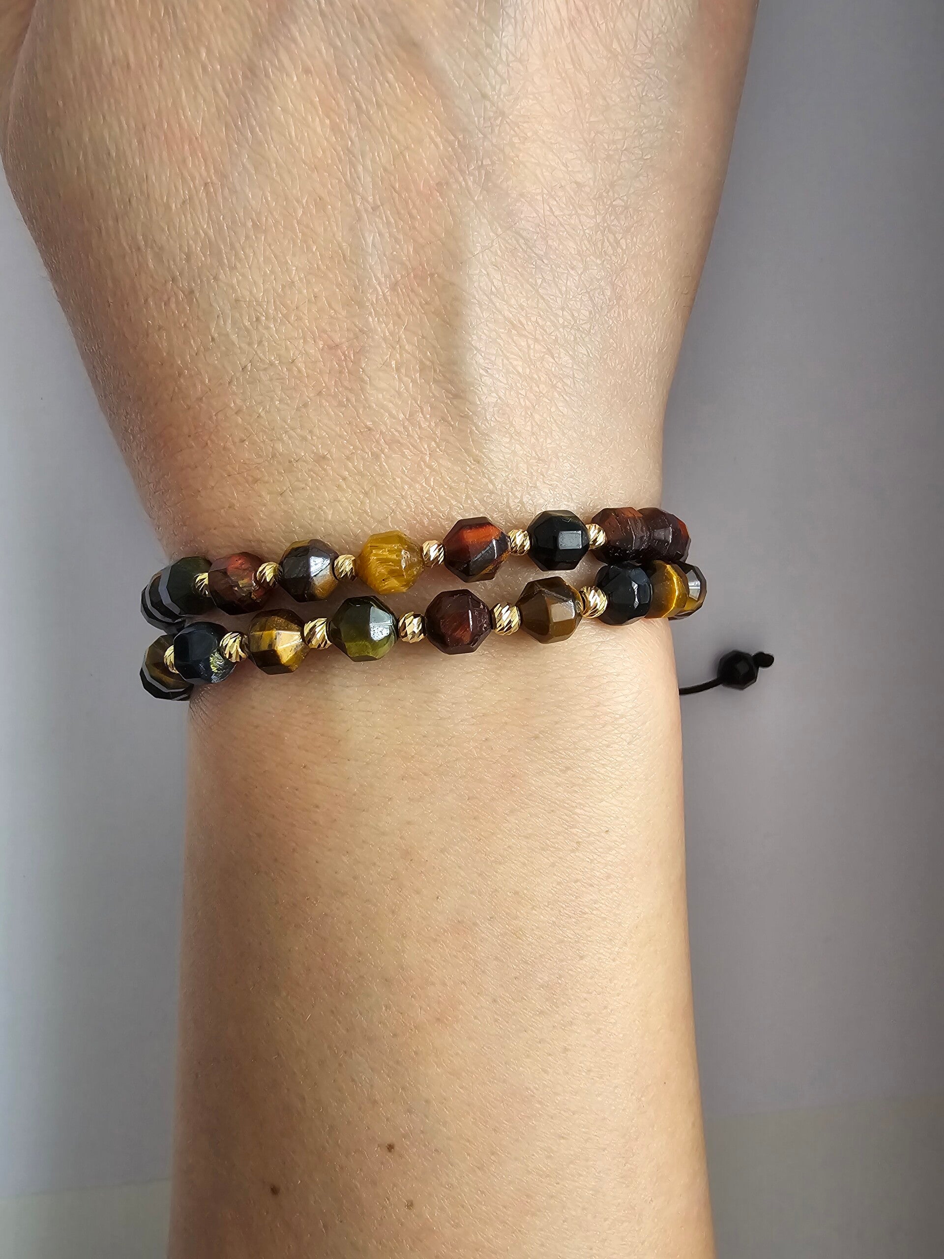 Bratara cu pietre Ochi de tigru curcubeu si 6 bilute aur 14k