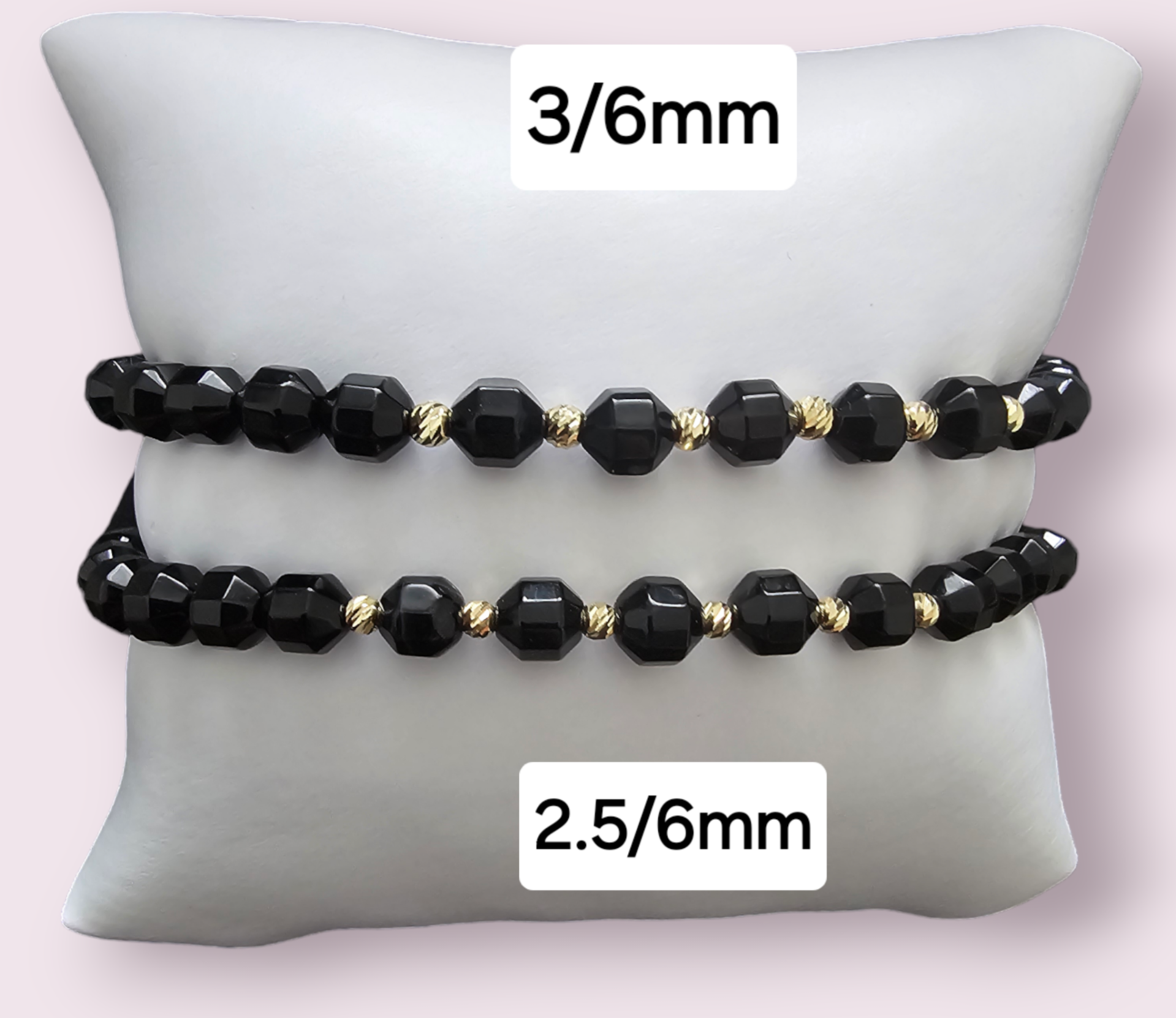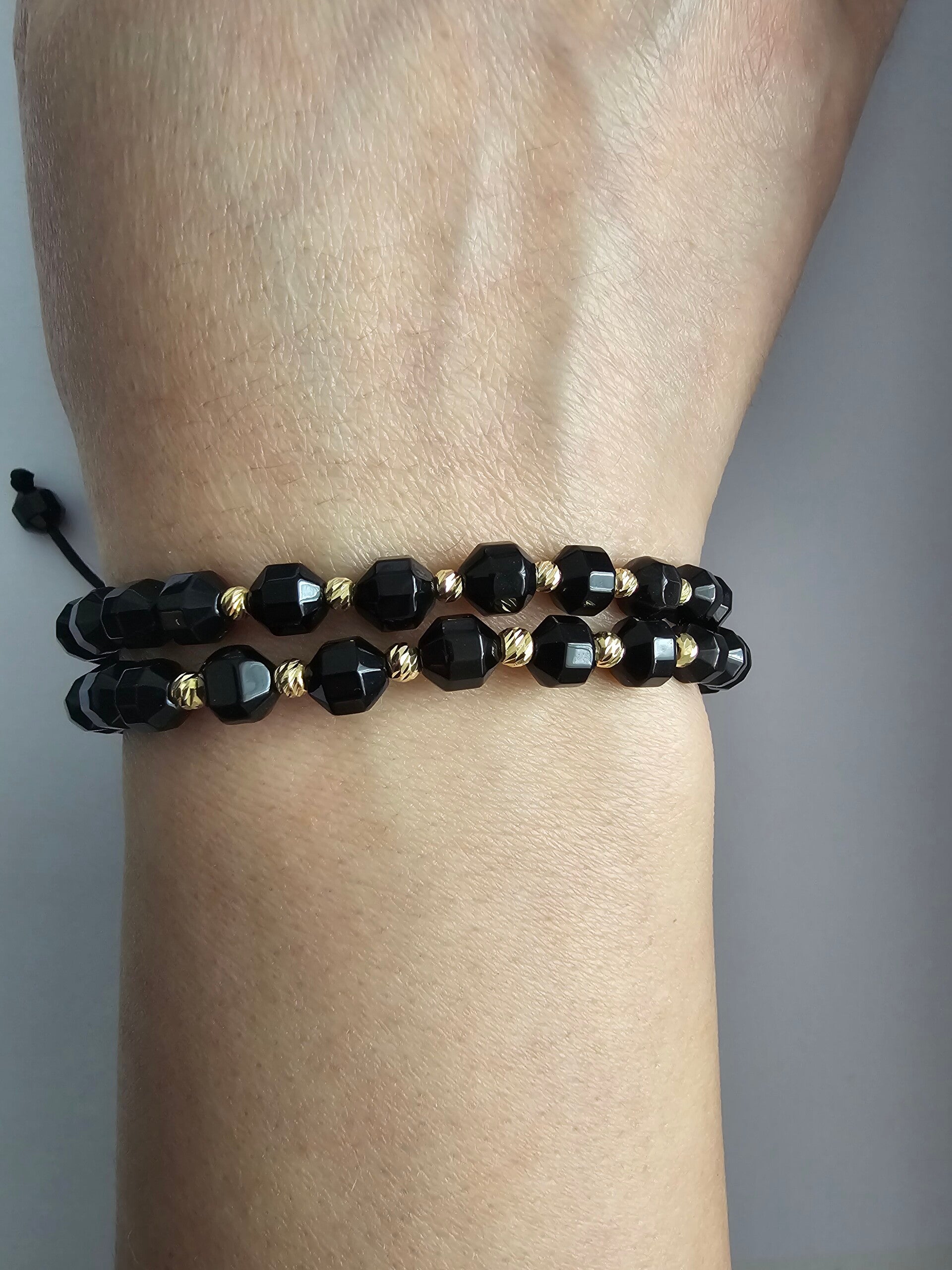 Brățară cu pietre naturale Agat Negru , realizată manual pe șnur negru reglabil, cu biluțe din aur de 14K (disponibile în mărimi de 2.5 mm sau 3 mm- 6 bilute ) si pietre naturale Agat Negru (disponibile în mărime de 6 mm).