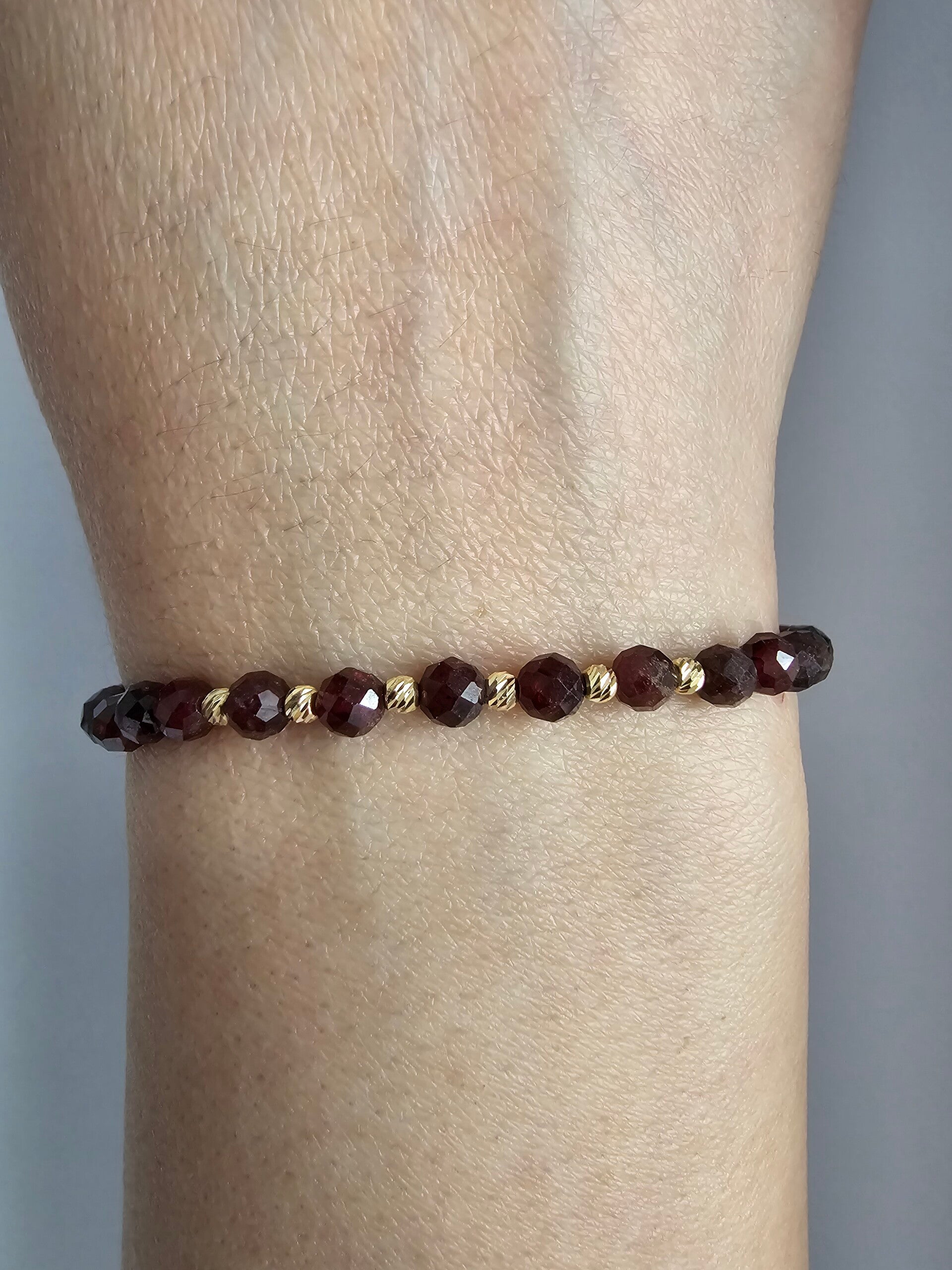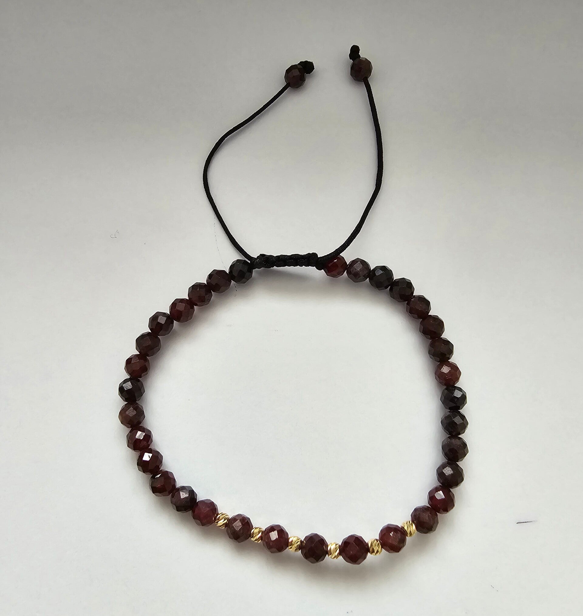 Brățară cu pietre naturale Granat, realizată manual pe șnur negru reglabil, cu biluțe din aur de 14K (disponibile în mărime de 2.5mm- 6 bilute ) si pietre naturale Granat (disponibile în mărime de 4.5-5 mm).