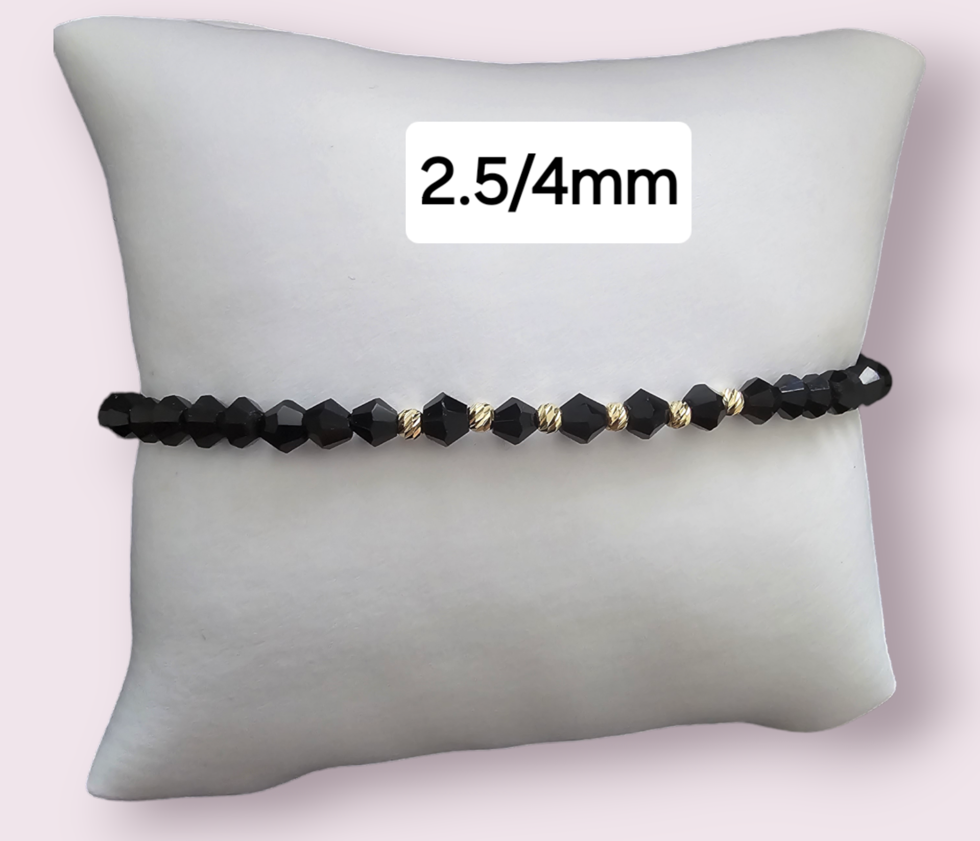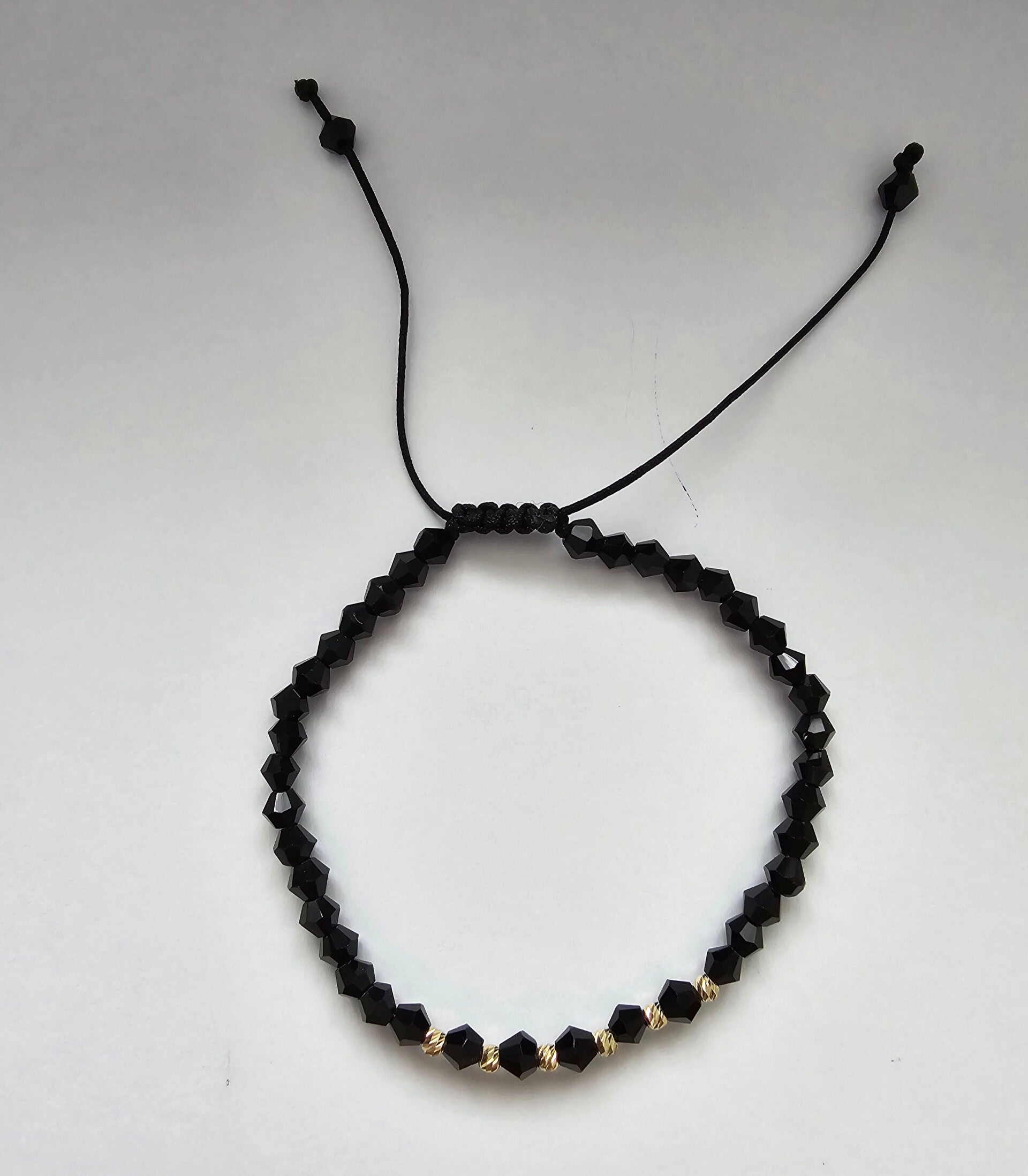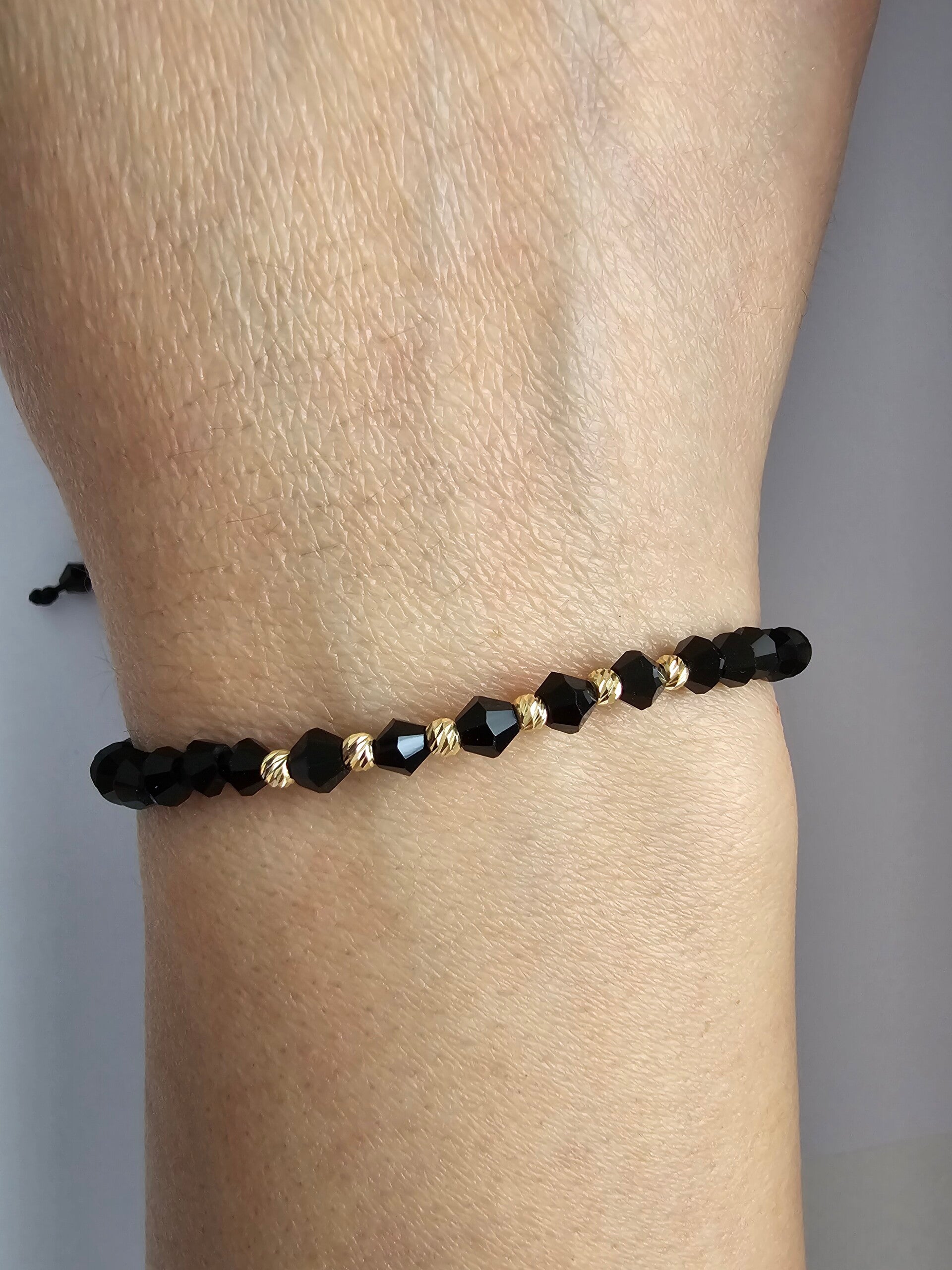 Brățară cu pietre naturale Cristale Biconice, realizată manual pe șnur negru reglabil, cu biluțe din aur de 14K (disponibile în mărime de 2.5 mm - 6 bilute ) si pietre naturale Cristale Biconice (disponibile în mărime de 4 mm).