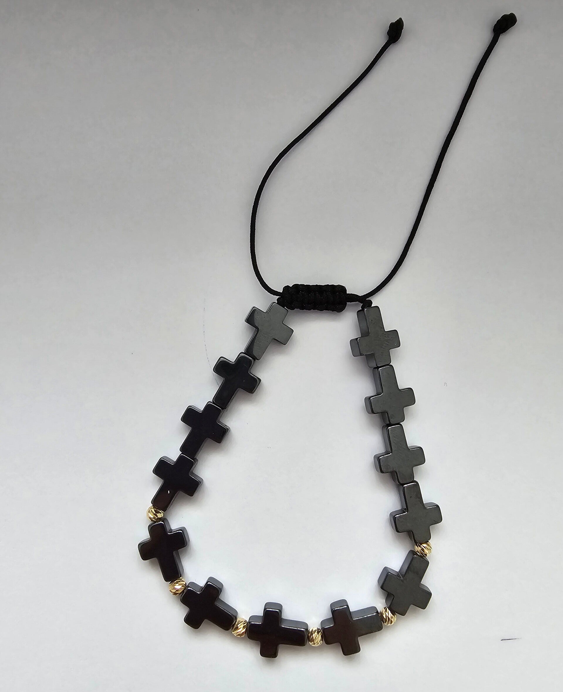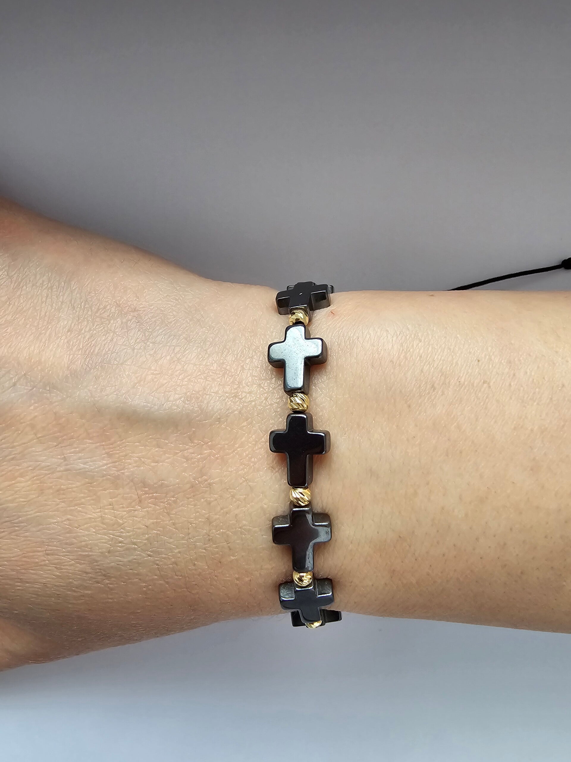 Brățară cu pietre naturale Hematit Cruce, realizată manual pe șnur negru reglabil, cu biluțe din aur de 14K (disponibile în mărime de 3 mm- 6 bilute ) si pietre naturale Hematit Cruce (disponibile în mărime de 8 mm).