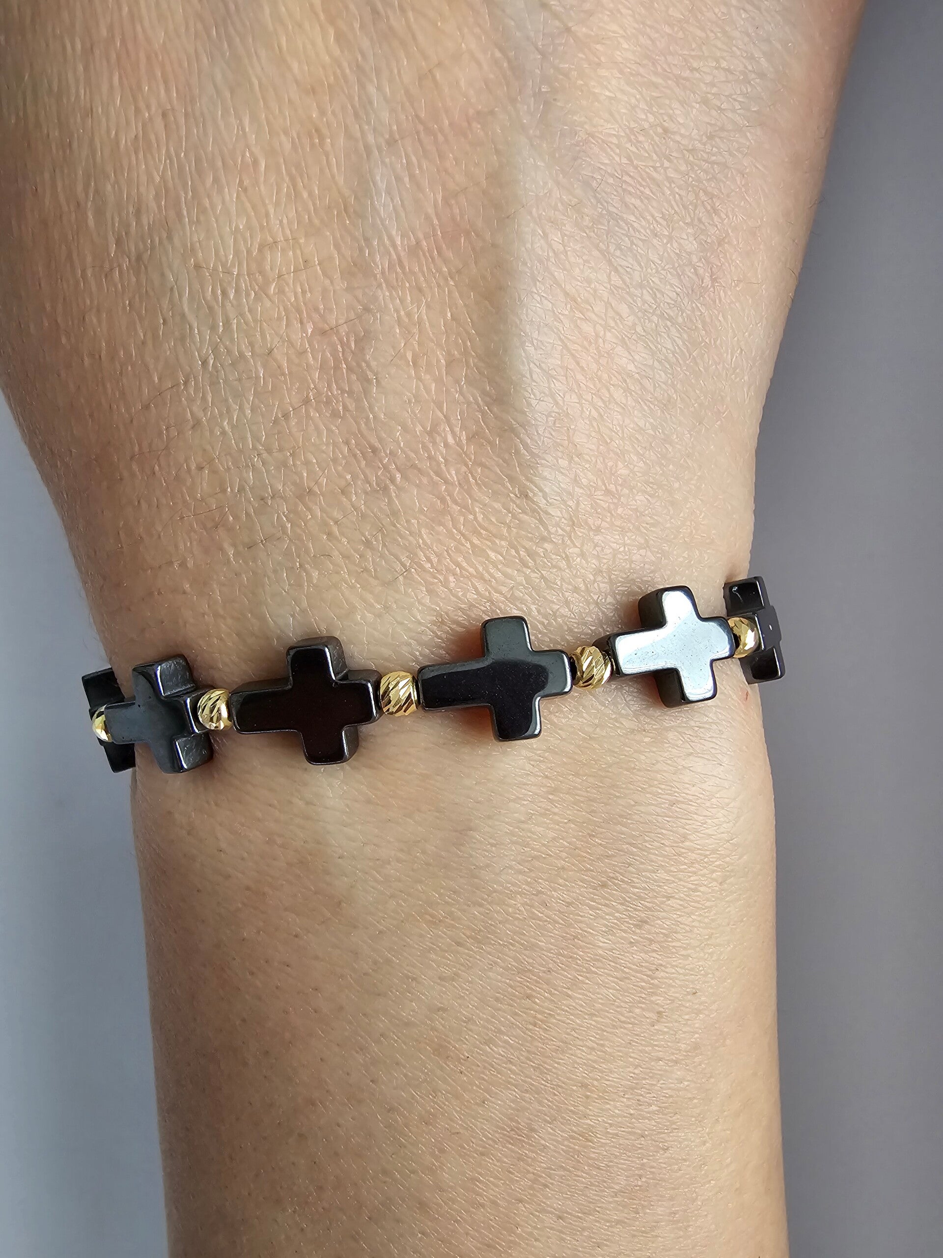 Bratara cu pietre Hematit Cruce si 6 bilute aur 14k