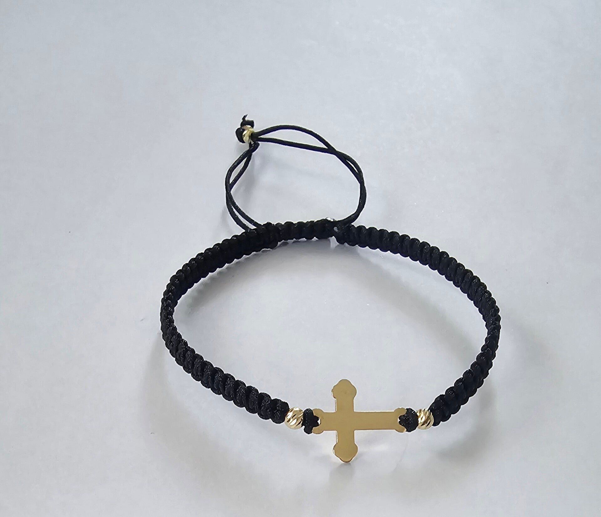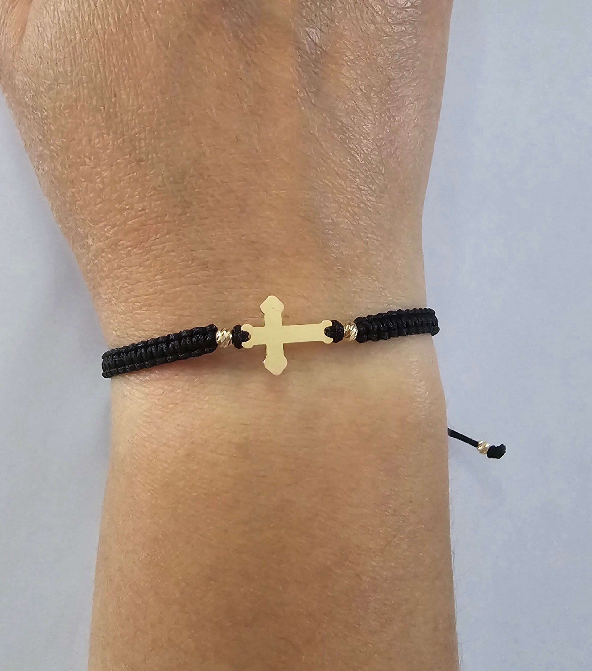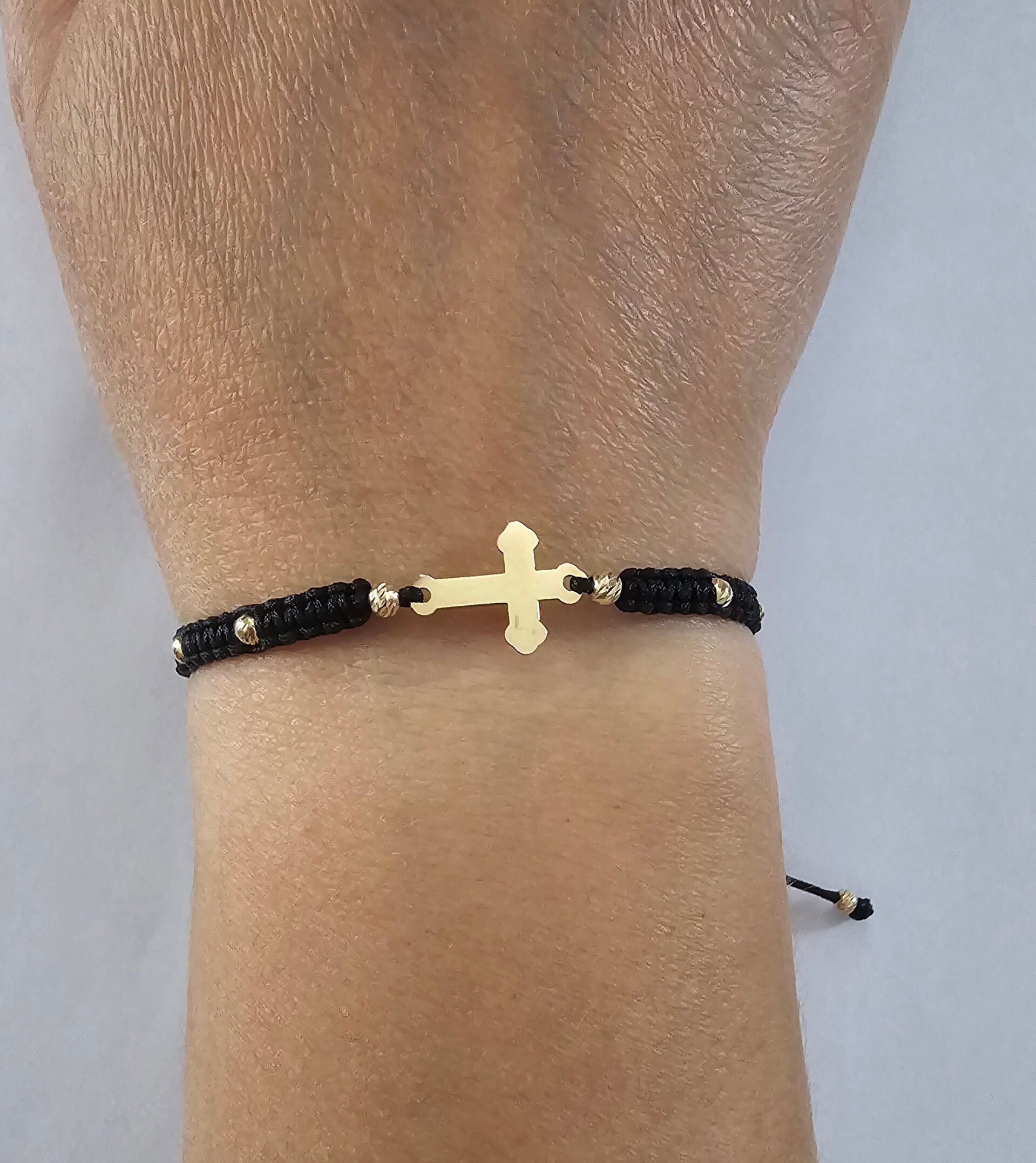 Brățară realizată manual din șnur reglabil, cu pandantiv cruciulita din aur de 14k (dimensiune-16/12mm) și, opțional, biluțe din aur de 14K (dimensiune-3mm) pentru un accent elegant.