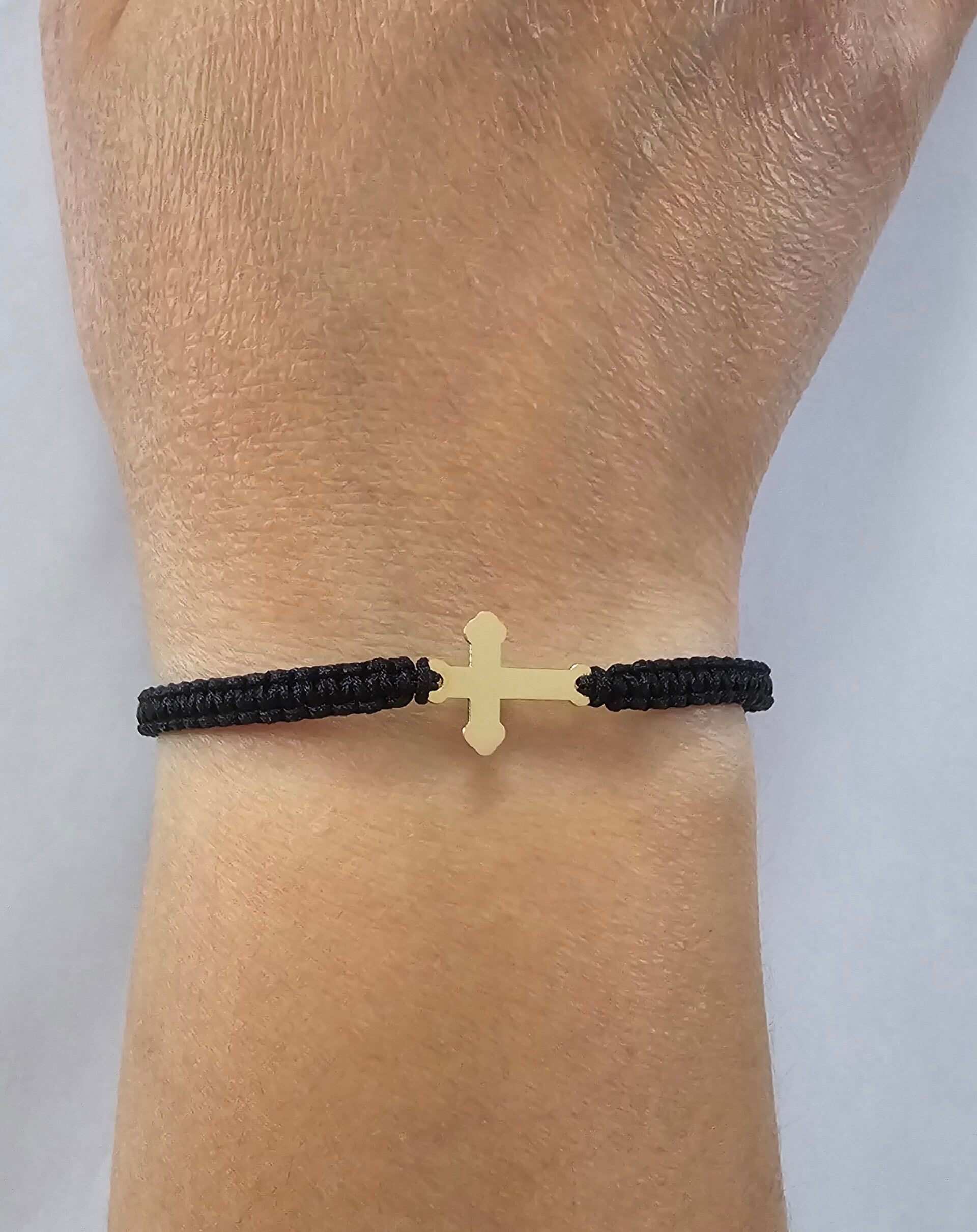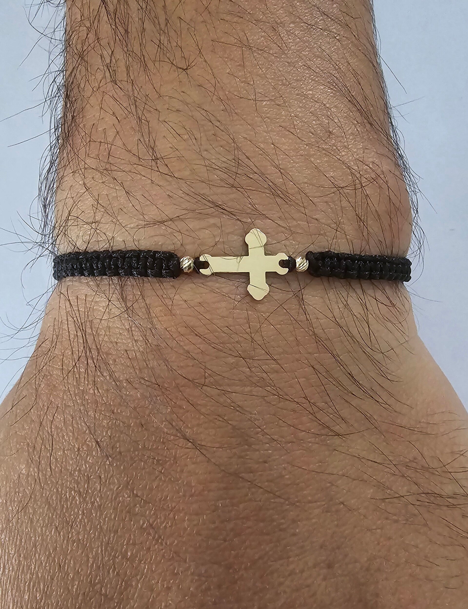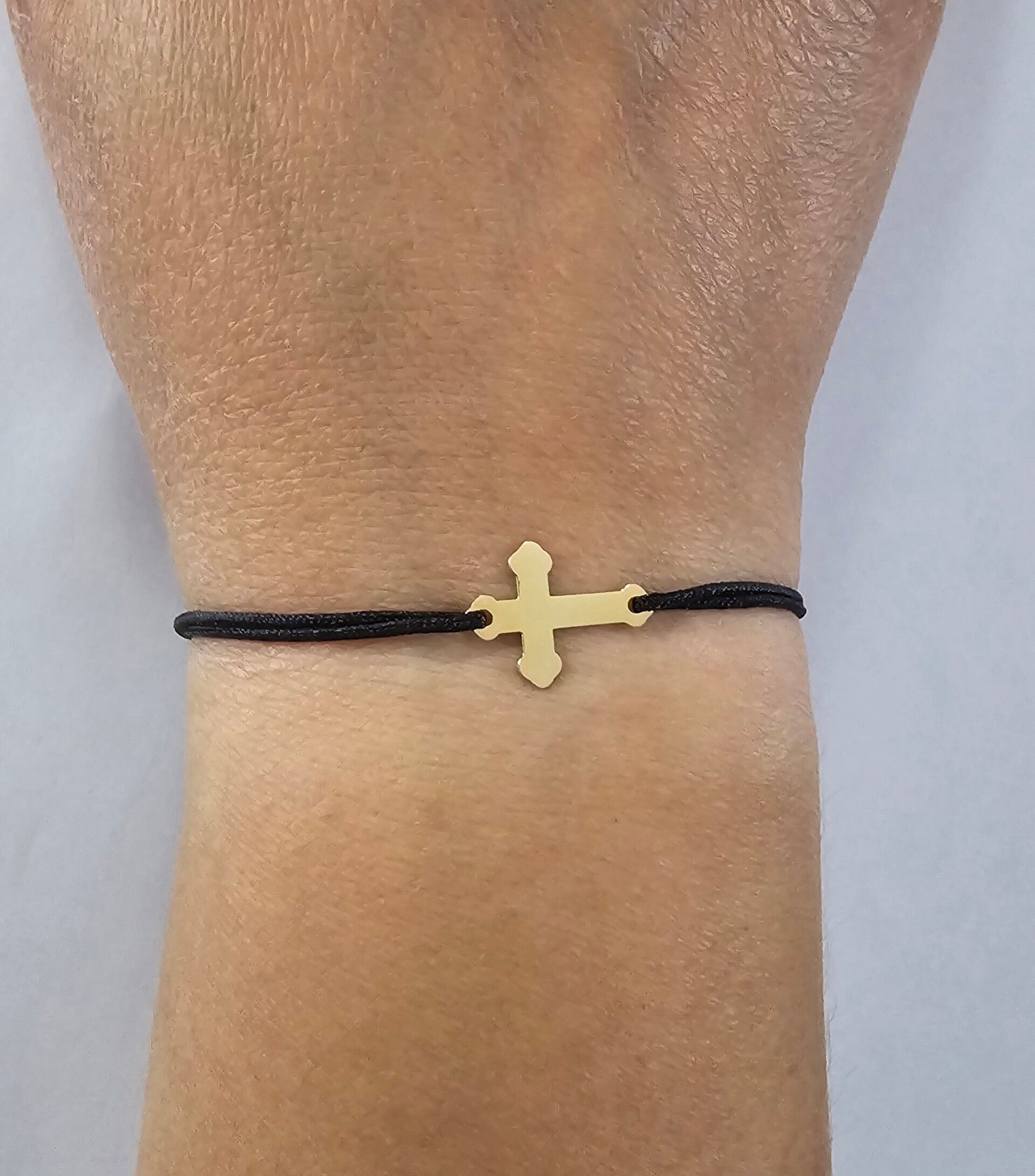 Brățară realizată manual din șnur reglabil, cu pandantiv cruciulita din aur de 14k (dimensiune-16/12mm) și, opțional, biluțe din aur de 14K (dimensiune-3mm) pentru un accent elegant.