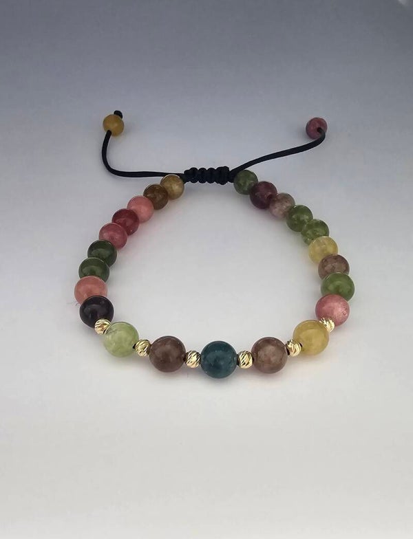 Martisor tip bratara din snur negru cu bilute din aur de 14k (2.5mm sau 3mm) si pietre naturale semipretioase Turmaline curcubeu (4mm sau 6mm).