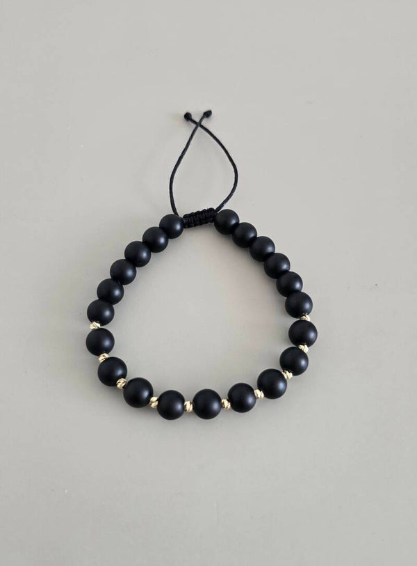 Brățară cu pietre naturale Onix negru mat, realizată manual pe șnur negru reglabil, cu biluțe din aur de 14K (disponibile în mărime de 3 mm- 8 sau 10 bilute ) si pietre naturale Onix negru mat (disponibile în mărime de 8mm).