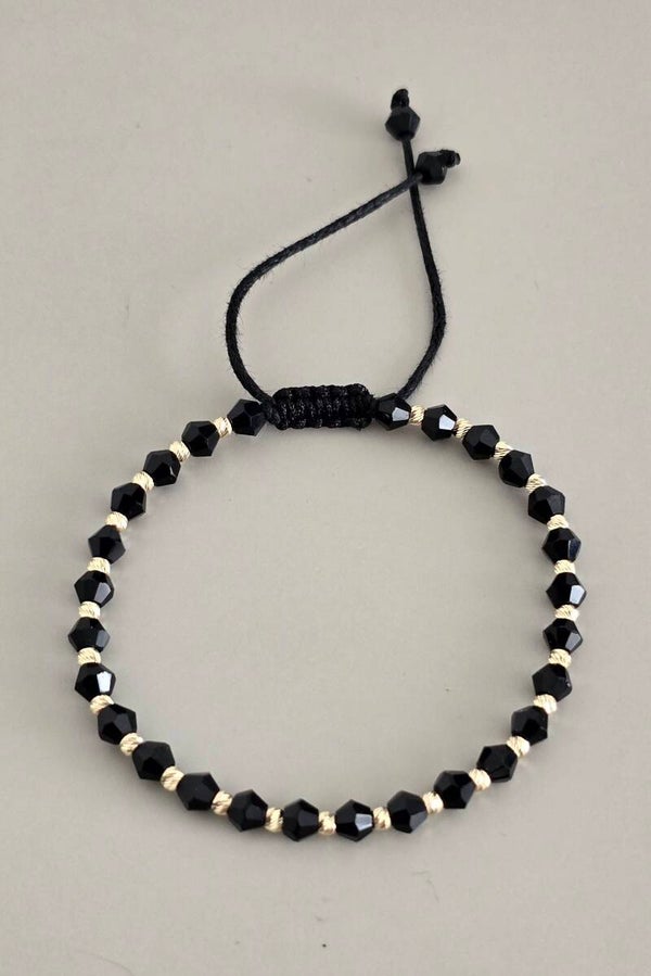 Brățară cu pietre naturale Cristale Biconice, realizată manual pe șnur negru reglabil, cu biluțe din aur de 14K (disponibile în mărime de 2.5 mm - 26 bilute ) si pietre naturale Cristale Biconice (disponibile în mărime de 4 mm).