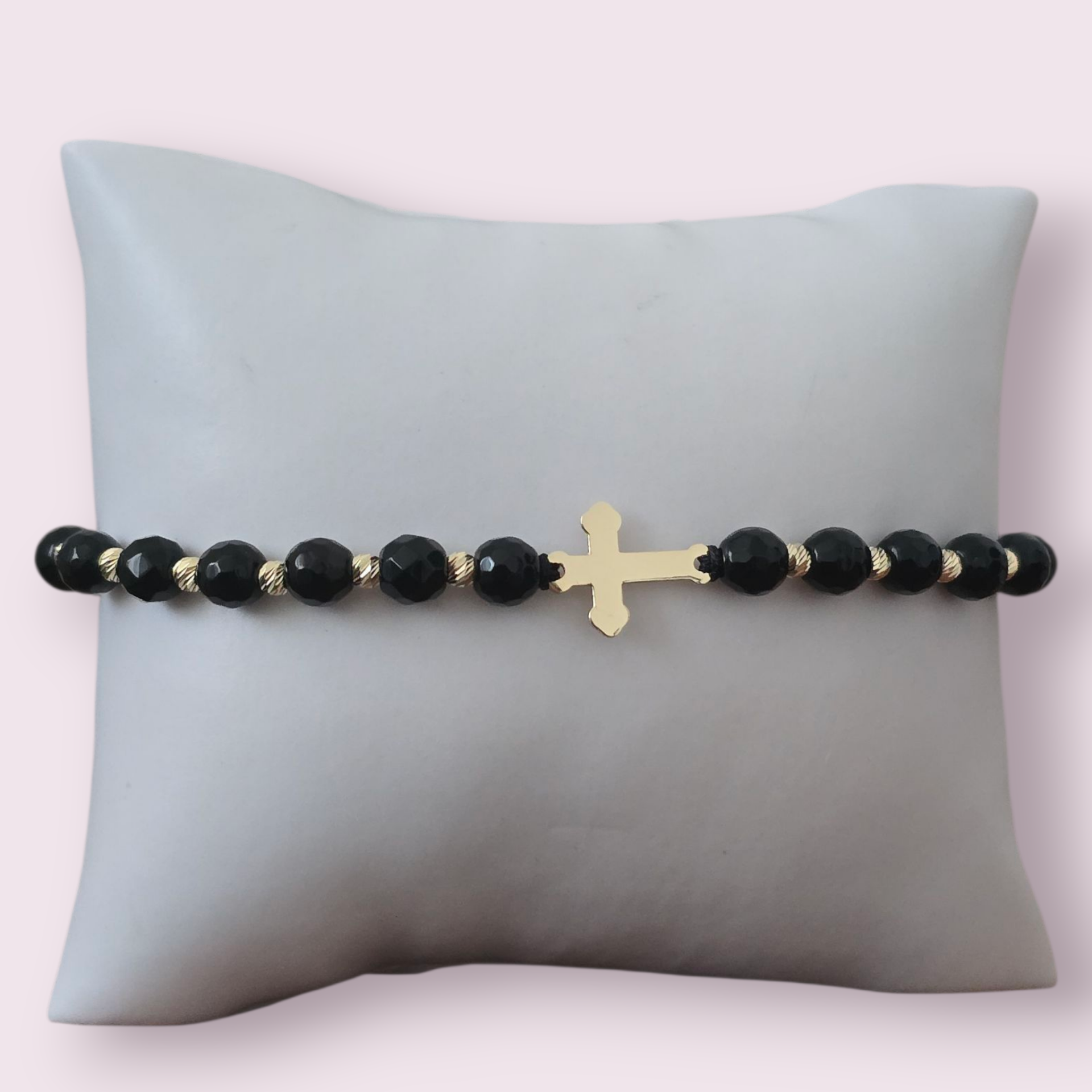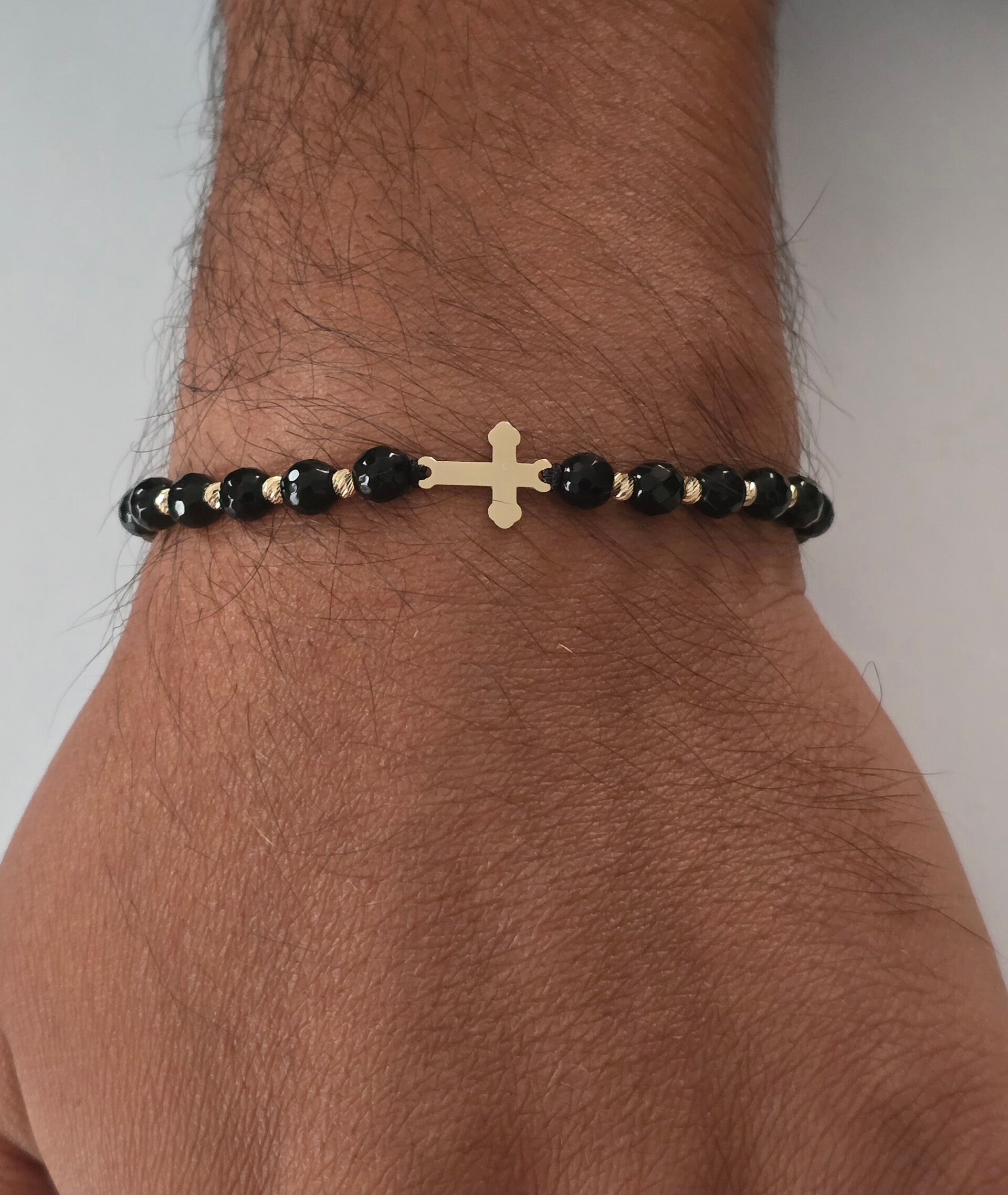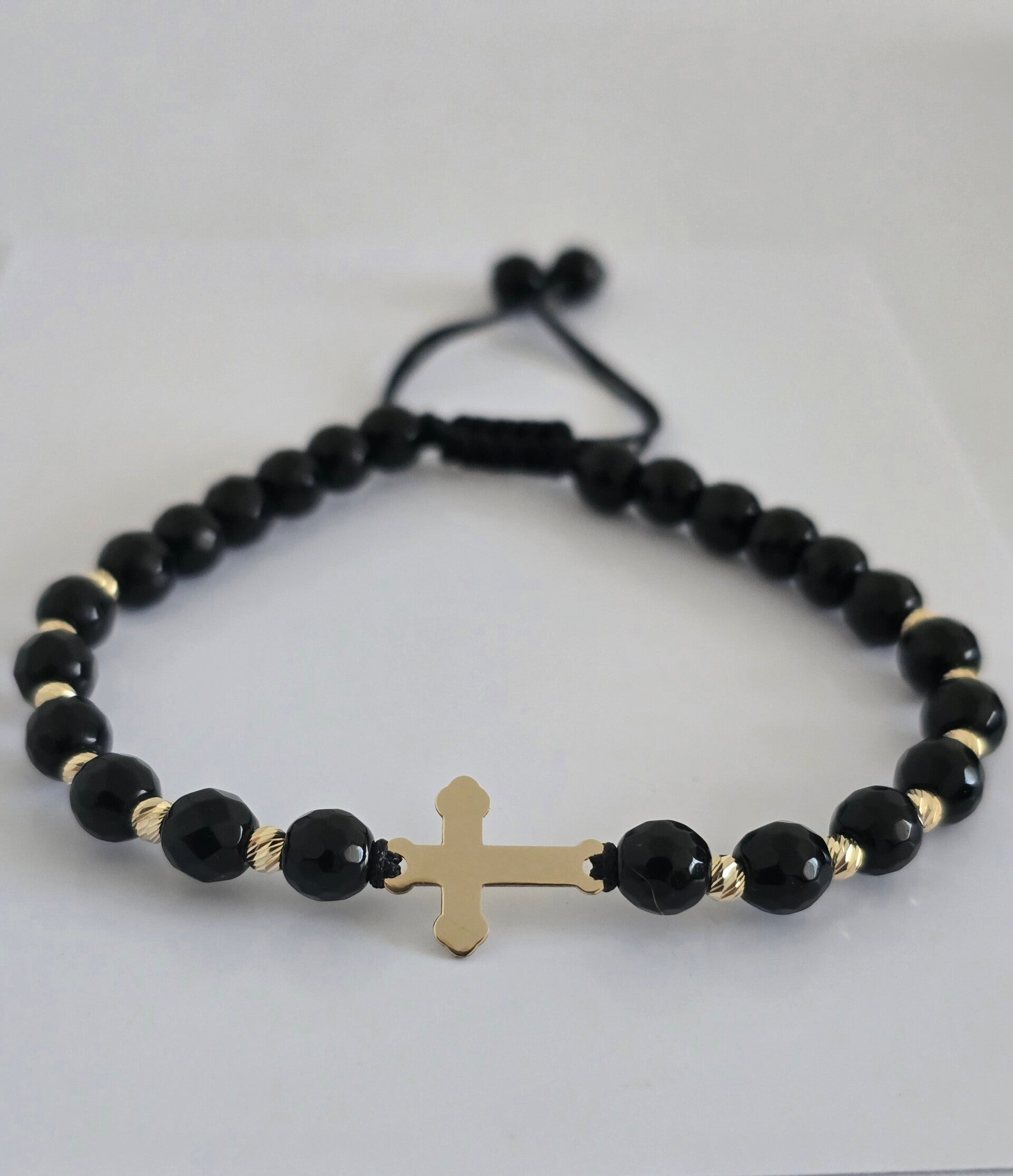 Brățară realizată manual din șnur reglabil, cu pandantiv cruciulita din aur de 14k (dimensiune-16/12mm), biluțe din aur de 14K (dimeniune 3mm-12 bilute) pentru un accent elegant si pietre onix ( dimensiune-6mm).