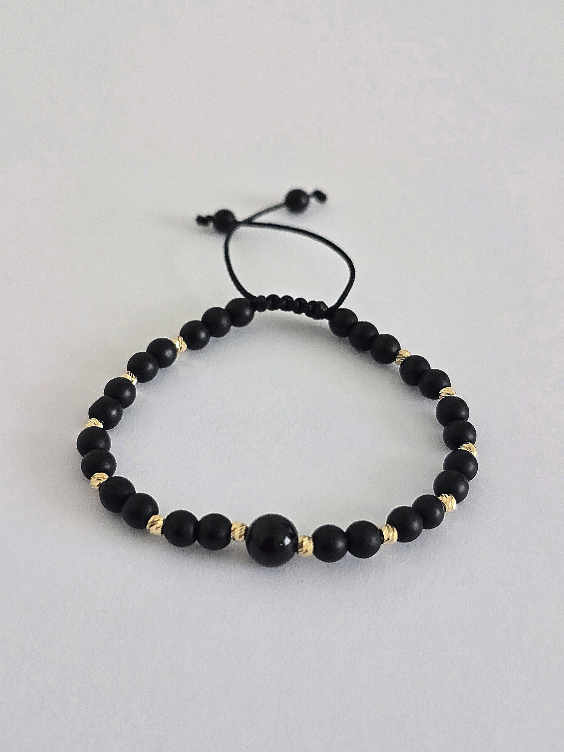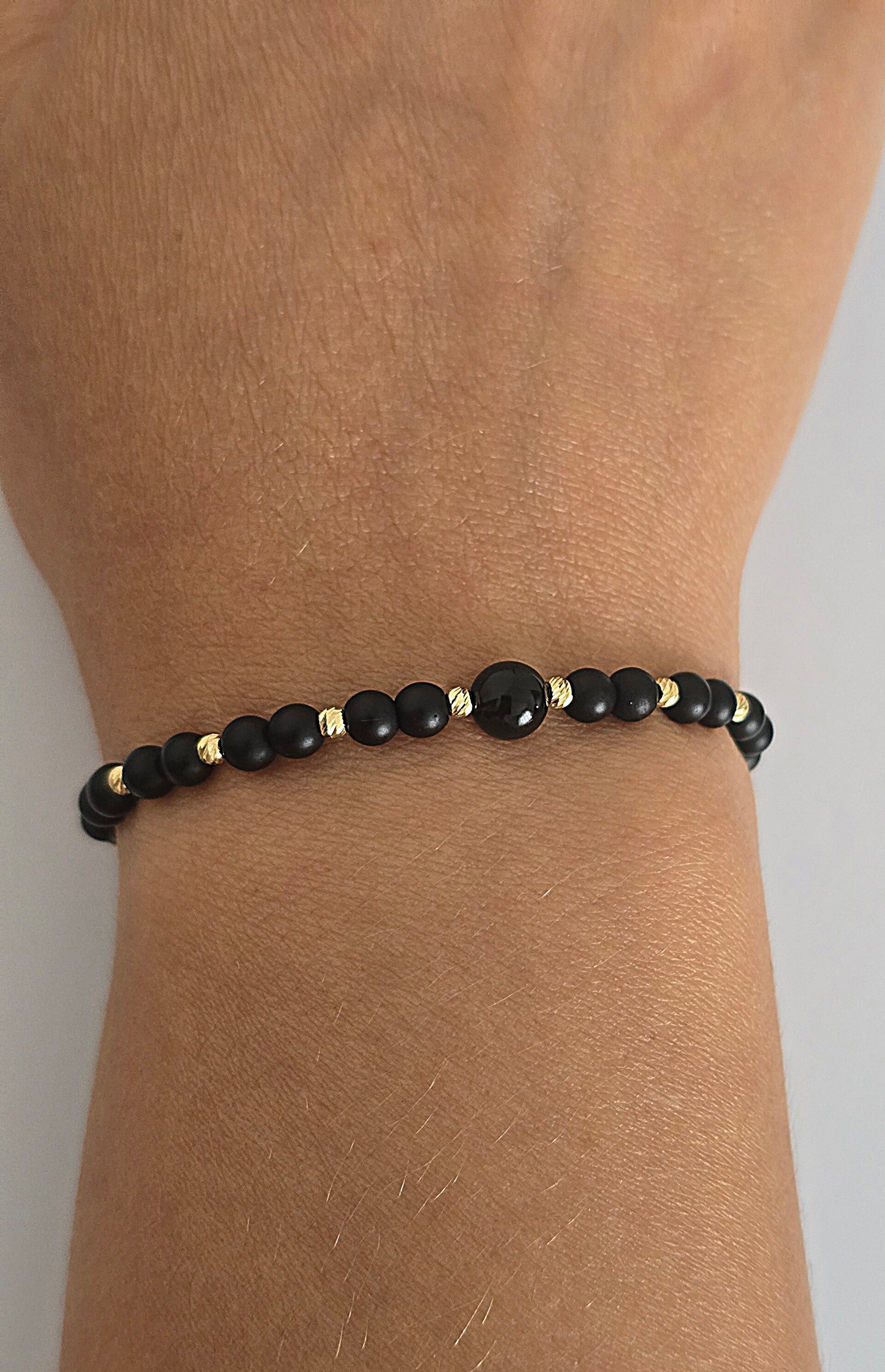 Brățară cu pietre naturale Onix negru mat (4mm) , 1 piatra onix lucioasa (6mm) si bilute din aur de 14k (12 bilute de 2.5mm) realizată manual pe șnur negru reglabil.