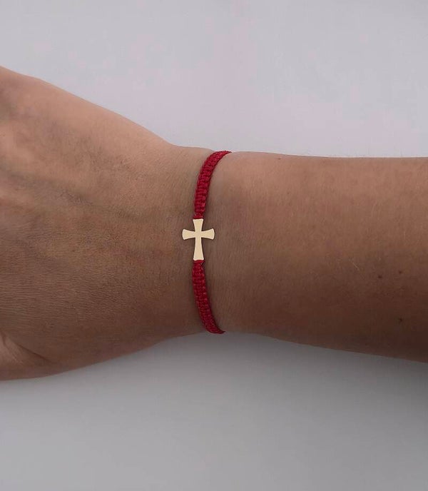Brățară realizată manual din șnur reglabil, cu un pandantiv cruciulita din aur de 14k (dimensiune-15/11mm) și, opțional, biluțe din aur de 14K (dimensiune-2.5mm) pentru un accent elegant.