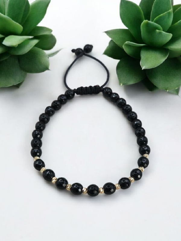 Brățară cu pietre naturale Onix Negru Fatetat, realizată manual pe șnur negru reglabil, cu biluțe din aur de 14K (disponibile în mărime de 3 mm- 10 bilute ) si pietre naturale Onix Negru Fatetat (disponibile în mărime de 6 mm).