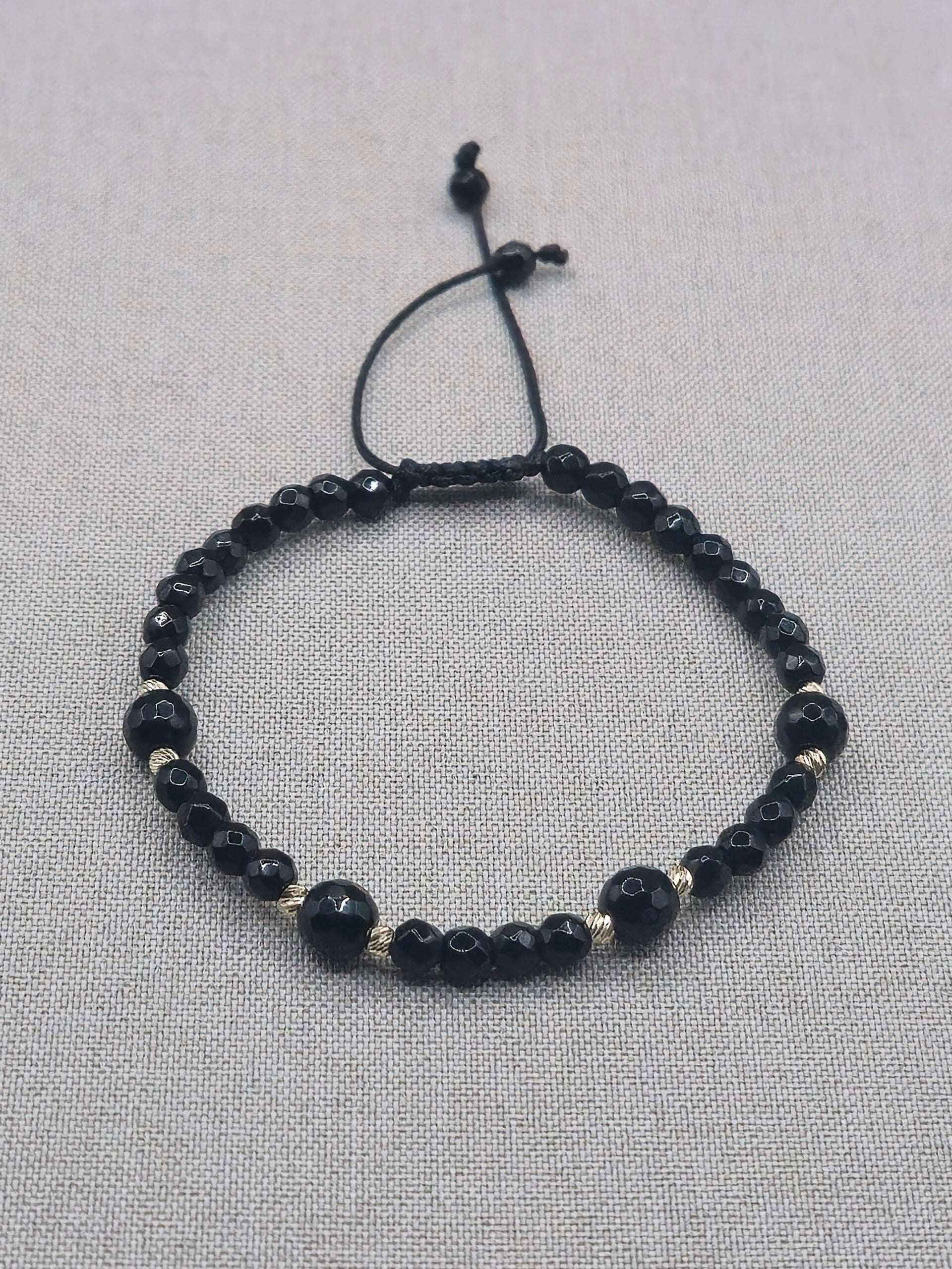 Brățară cu pietre naturale Onix Negru Fatetat, realizată manual pe șnur negru reglabil, cu biluțe din aur de 14K (disponibile în mărime de 2.5 mm- 8 biluțe ) și pietre naturale Onix Negru Fatetat ( 4mm și 6mm)