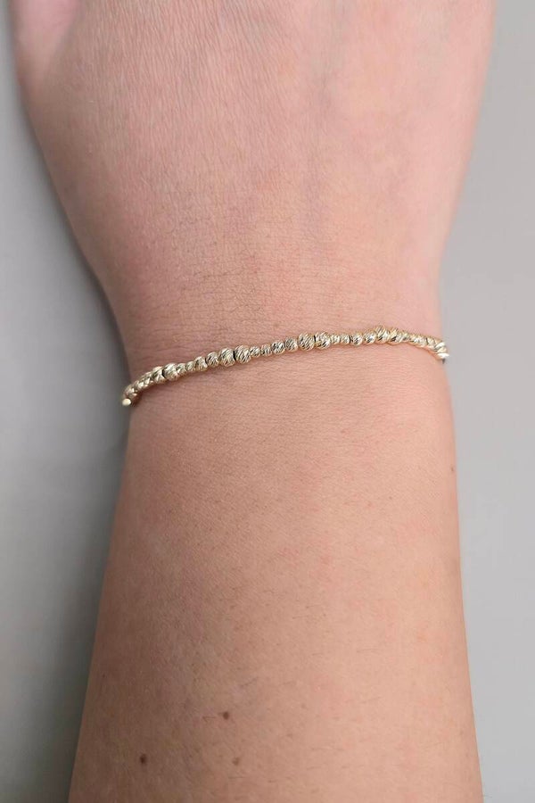 Aurul de 14K îi oferă durabilitate și rafinament, iar sistemul reglabil o face potrivită pentru orice încheietură.
